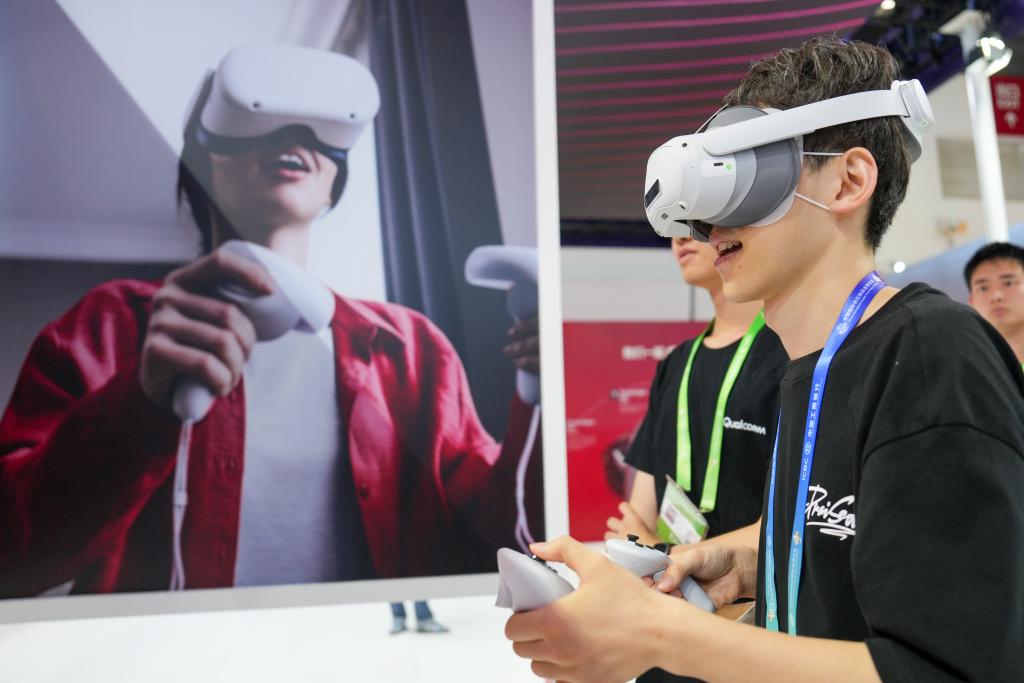 7月17日,参观者在数字科技链展区高通展台体验搭载了高通公司芯片的产品。新华社记者鞠焕宗摄